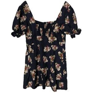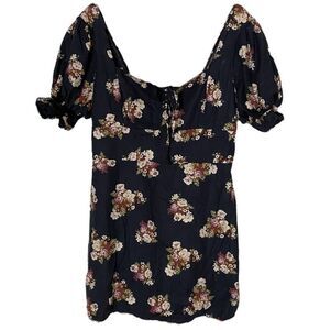 Anthropologie Maeve black and pink floral print square neck puff sleeve mini dress.