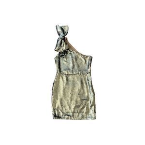 Anthropologie Maeve metallic allover sequined lined bodycon one shoulder mini dress with bow detail on strap.