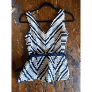 Chevron striped pattern. Navy and white. Sweetheart neckline. Sleeveless. Peplum style. Bow accent tie at waist