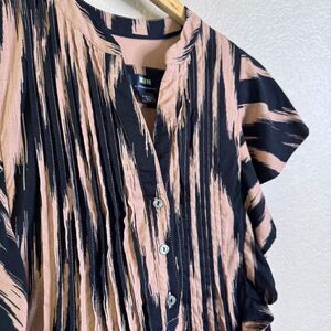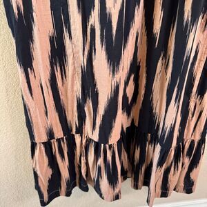 Long maxi length dress with ruffle flutter sleeves. This dress is a classic from Maeve Anthropologie. Pintucked detail at chest and back of dress. V-neck with button closure top. Two hidden side seam pockets. Dress is fully lined. Tiered ruffle bottom hem. Artsy, painterly print with colors of a soft tan and black.