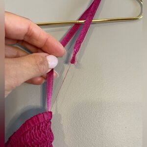 Such a sweet little fuschia silk dress from Anthropologie brand Maeve, in a size 2. Featuring a babydoll design, with removable/adjustable shoulder straps (pictures shown with, and also separate as they will come with the little separate bag) so it could be worn strapless or with straps, smocked waist, and ruffle hem with lace detail to the inner lining; two side pockets!