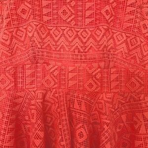 This Maeve burnt orange dress is the epitome of femininity with it’s lace outer shell and asymmetrical handkerchief hem.