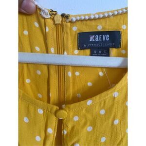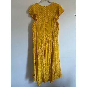 Features: yellow midi dress with white polka dots, keyhole neck detail, flutter sleeves, a-line midi dress, back zip closure