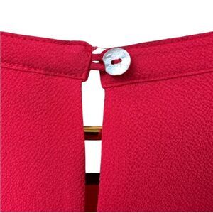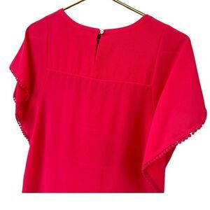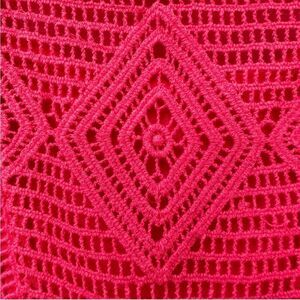 Oversized flutter / dolman style sleeves with crochet trim, round neck with back button. Small pleats down the front, crochet bodice that is lined at décolleté. Polyester and spandex blend. Relaxed fit. Coral/red color. Approximate measurements are pit to pit 19”, length from shoulder approximately 26”.