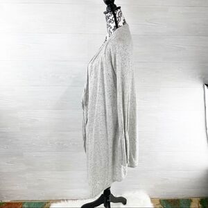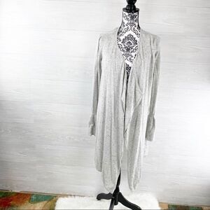 Anthropologie Moth Lyra bell sleeve cardigan size small. Grey speckled wool/cashmere/viscose /nylon blend material with stretch. Longline waterfall Ruffle silhouette with bell sleeve ribbed cuffs. Open drape front with high-low hemline. One small spot that has been messed and has a small spot, not noticeable on exterior, interior shows mending as pictured. Very hard to see. Lightweight and beautiful!