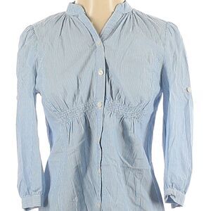 Cute cotton button shirt with gathering under bust, long shirt tail hem, sleeves take can be rolled up. Back waist has button detail. Good condition