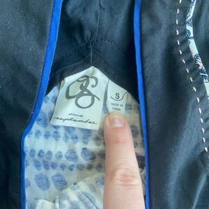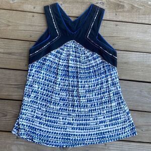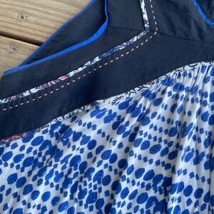 Tank top has a navy blue cotton top with contrasting stitching and floral piping. Bottom is a white jersey material with blue dots.