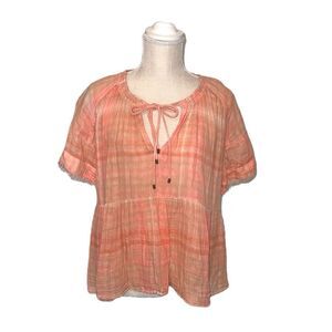 Pilcro and the Letterpress Peach Striped The Bette Babydoll Top . Rendered in rich, spring-ready hues, the Bette offers an easygoing yet oh-so-poised twist on classic feminine style. Consider pairing its dainty aesthetic with utility joggers and strappy sandals or flats - it's a relaxed, playful look we love to sport for sunny strolls and family picnics. Features gauze-like cotton; lightweight and somewhat sheer in the light. Frayed trim on shorty sleeves. Spliced neck with dual tie. Babydoll silhouette. Pullover styling All-Over Striped Plaid Print. Unlined. Trending tangerine color hues! Absolutely adorable top!