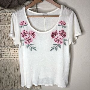 EUC short sleeve top with beautiful floral embroidery detailing and beading. Looser fit — is an extra small but can easily fit a small since it’s oversized/relaxed fit. Fabric content: 72% rayon, 28% linen. Approx. measurements: Bust: 18 inches Length: 23 inches