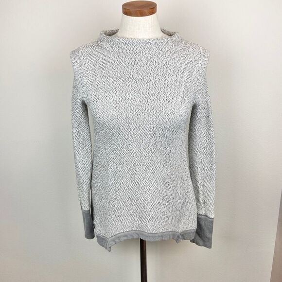 This sweater is in excellent condition. Featured with a funnel neck and knit design throughout. Light gray in color and size XXS. Made from cotton and other fibers. Please send any offers or questions!