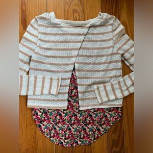 Lightly worn. Mixed pattern print with beige stripes on top and floral print below. The top is a lightweight sweater. Layered back. Size XS