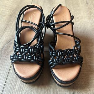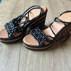 Anthropologie Raffia Espadrille Wedge Platform Ankle Wrap Sandals Black Tan 39