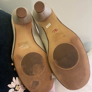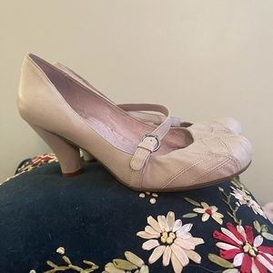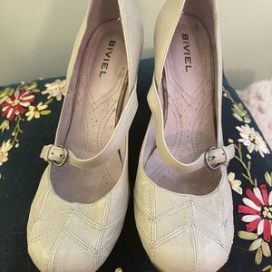 This artsy, retro style vegan leather Anthropologie’s Biviel heels in a different bone shade add elegance to any outfit. Mary Jane adjustable strap. 3” heel. Faux Leather interior. Size 7