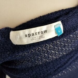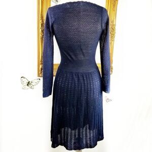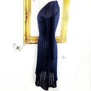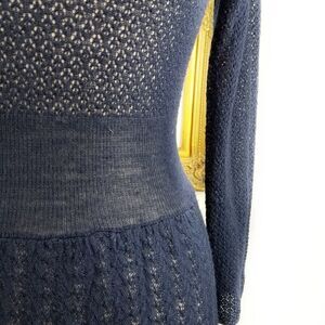 Gently loved Anthropologie light weight crochet knit dress. Scalloped trip at neck and wider band waist. Has stretch. Would wear with a slip unless you're feeling adventurous :)
