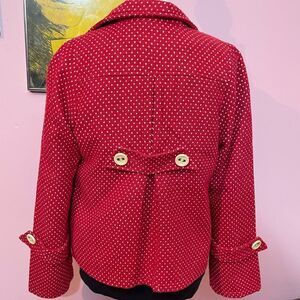 Excellent pre-owned condition white polka dot on red cropped retro style lightweight coat by Santuary Clothing from Anthropologie, size extra-small. Will fit a small, too.