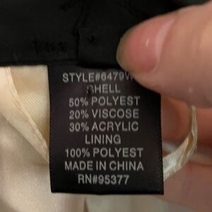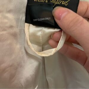 Fully lined, faux double breasted look with fold down or button up collar. Cream colored buttons. Pleated rear with martingale detail on back. Button accents on cuffs.