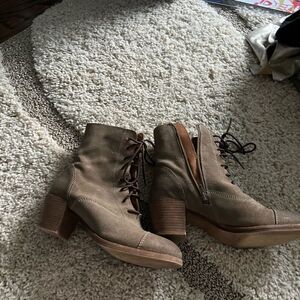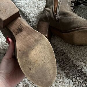 Anthropologie Seychelles tan suede lace up boots stacked heel wood
