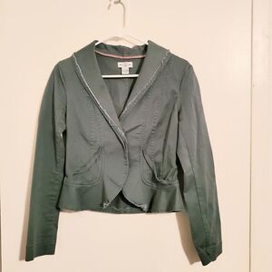Olive green blazer jacket with front pockets. Button closure. Very cute! Pre-owned in great condition. Please see pictures as they are part of description. *Color looks slightly lighter on pictures.