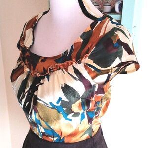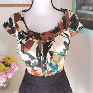 Silk bodice with ruffles at neckline and cap sleeves. Blousy at waist line. Brown tweed skirt with pockets.Pleats in front, a tiny bit of elastic at waist in back for a perfect fit. Lined. Size 2 measures 34 at chest. 25-28 at waist, 36 at hips. Perfect for now and to transition to cooler weather. 8THVL