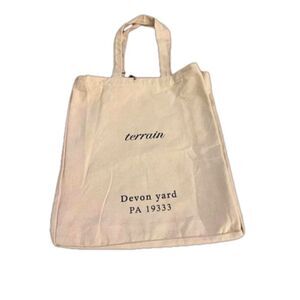 The classic Terrain logo pops against a natural color exclusive tote bag. With handles and crafted from a hard-wearing cotton that will just get better with age. Perfectly sized for the farmers' market, work, the beach, running errands, or stopping by Terrain! A terrain exclusive Canvas Spot clean; do not tumble dry Imported Please note: label / tag has been marked to help prevent store returns, most of my items are this season & still being sold in store, sold out, rare / one of a kind, hard to find, custom picked by me, thank you for shopping my closet!