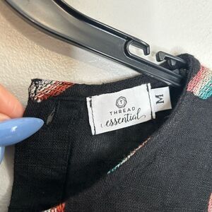 Size M. 100% cotton. Striped Ruffle sleeve romper. Black ground with multicolor stripes. Button up back.