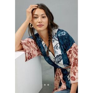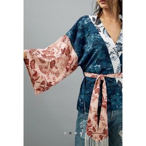 Anthropologie Tori Floral Cropped Belted Kimono Blue Multi One Size