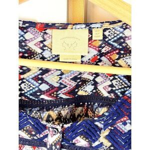 This Vanessa Virginia multicolor blouse, size 2P, offers a boho tribal pattern, accentuated by 3/4 sleeves and intricate embroidery. Made from 100% polyester, it's a chic, Anthropologie piece.