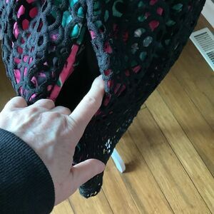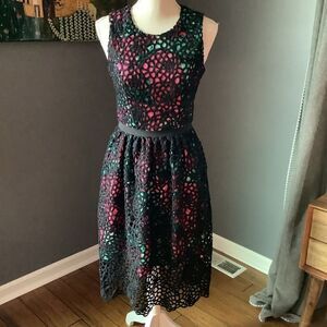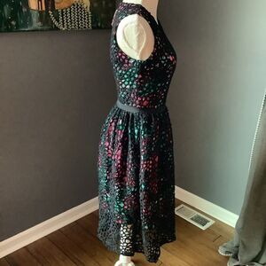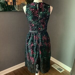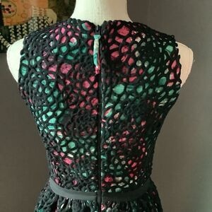 Stunning, black eyelet dress with multicolored under lining and full black dress lining. Love the hem on the dress. Just adorable. Size 0. Measurements are approximate