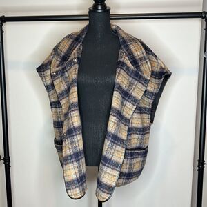 Anthropologie cape/jacket. One size. Plaid with leather detailing all around edges. Great for fall. Worn once. Excellent condition. No flaws. Length is about 26”. Smoke and pet free home.