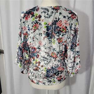 This ANTHROPOLOGY MAEVE Silk Velvet Floral Boho Wrap Top is in nice preowned condition! It is a silk velvet blend with a burnout look, multicolor floral, surplice crossover neckline, flowy half sleeves, bohemian look! 78% viscose, 22% silk.