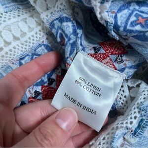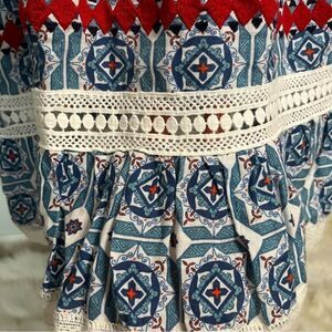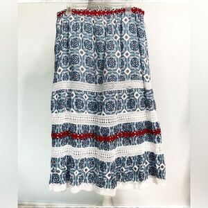 Pretty skirt by Anthropologie brand rinku. Features a gorgeous mosaic like pattern with contrasting red embroidered detailing as well as accents of white crochet designs. Great preowned condition without any significant flaws. Lying flat waist approx 13.5” across and top of waist to bottom hem approx 27.5”. All measurements are approximate