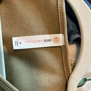 This Anthropologie Daily Practice bubble dress is sized M and in gold. The "one-piece but two different fabric" look is so easy to wear and has a wonderful contrast in the material. Form fitting knit on top is complemented by the cotton skirt on the bottom with the tufted material to form the waist. The skirt portion has the bubble look which is so much fun: wear it open and loosely tied or tie the bottom tight which makes the bubble rise higher and fold over. The material has a natural coloring to it so you will see lighter and darker shades. Pockets on both sides in addition to separate cargo pockets. Length is just below the knee.