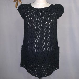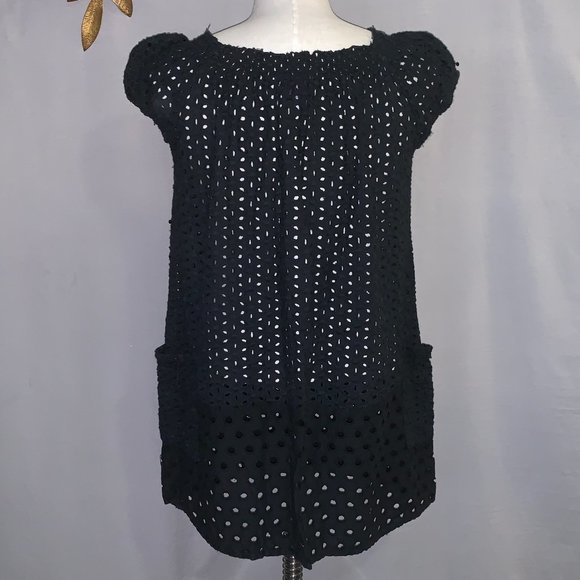 Anthropologie's Muche et Muchette Cover-Up - one size. (However, I do think it's more around a Small/Medium size.) Navy blue eyelet cotton fabric. Has an occasional sequin stitched on to throw a spark. Really cute cap sleeves and side pockets. Excellent used condition.
