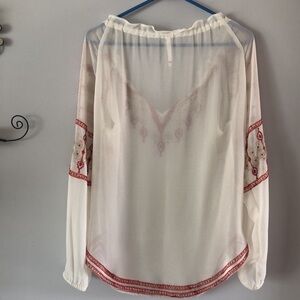 Worn a couple of times at most. This could pass for new. This Bohemian style top is so gorgeous in person. My pics are doing it justice. Amazing detail to this blouse. Perfect for the Spring/Summer. Dress it up or down. Smoke free home. Bought at Anthropologie. No material tag. I cut it out because it was visible when worn. 100% Polyester. I washed it in a garment bag, on delicate and hung it to dry.