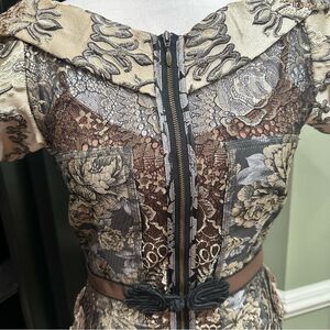 Absolutely stunning and rare Byron Lars “Beguile” dress – a mixed-media masterpiece with a structured yet romantic silhouette. This intricately designed piece features contrasting floral tapestry panels, embroidered lace, and a velvet-trimmed belt that cinches at the waist for a flattering fit. A true collector’s piece for lovers of vintage glamour and modern detail.