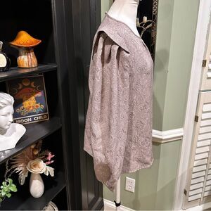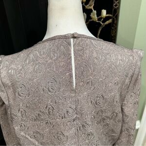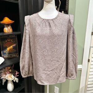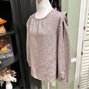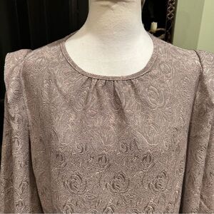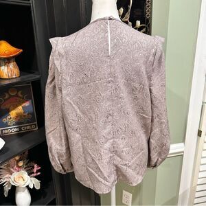 Elevate your wardrobe with this romantic puff shoulder blouse from Current Air Los Angeles. Featuring a soft taupe-rose hue with a delicate tonal floral jacquard texture, this top blends vintage femininity with modern edge. The dramatic shoulder pleating and subtle balloon sleeves finished with buttoned cuffs add the perfect amount of structure and softness.