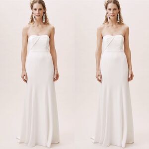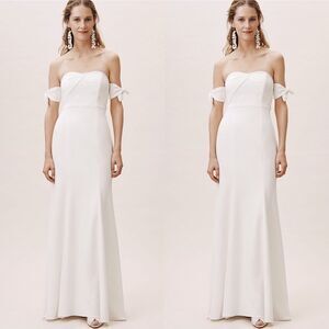 A soft sweetheart neckline and flattering seams down the skirt of this crepe dress combine for a truly timeless look. The off-the-shoulder sleeves are removable for a sleek, strapless ensemble.