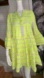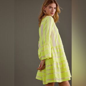 Vibrant neon yellow mini dress. Features flared sleeves and tiered design. Perfect for a bold look.