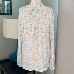 This has a bit of an oversize fit .. inverted pleat in back, longer length in back, stitched wrap, white with light gray Spacedye stripes