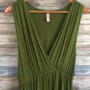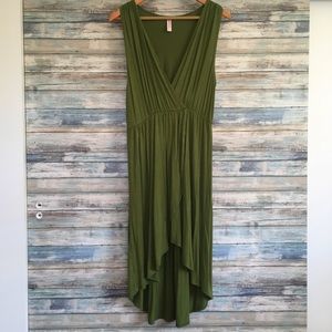 Super flattering Draped Faux Wrap Dress. Olive green with elastic waist. Super cute with a belt. Great with leggings and boots.
