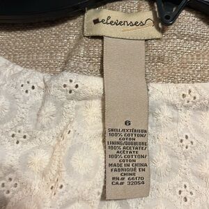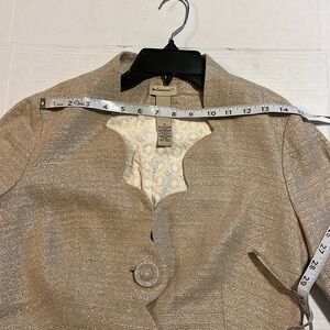 Anthropology Elevenses-6-beige, Elegant Metallic Scalloped cropped blazer/jacket. Shimmery, sparkly. Lined. Two big buttons to close in front, two buttons at the cuffs. 100% cotton. Lining-100% acetate.Chic metallic blazer with unique scalloped edges. Ideal for a sophisticated women. See photos for approximate flat measurements. Office siren, office core, Boho, chic.