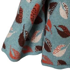 Anthropologie Guinevere Windy Day cardigan sweater. It features a funnel neck, scalloped button front and three-quarter slightly belled sleeves with a leaf print in orange, white and brown on light aqua blue.
