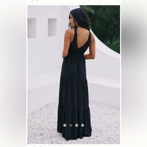 This stunning black maxi sundress by L*Space features a plunging V-neckline and a sleeveless design, ideal for cocktail parties or a night out. The dress flows elegantly from the waist, creating a sophisticated A-line silhouette. Its luxurious fabric and high side slit add a touch of drama and movement.