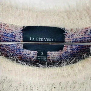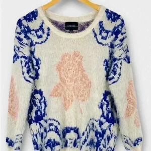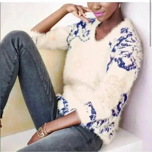 Classy and unique, this sweater is soft, and fuzzy! Has a bit of stretch too. Featuring a stunning embroidered rose on the front, and metallic fabric in blue filigree atop the sleeves/arms. Easily dress this up or down to your liking!!