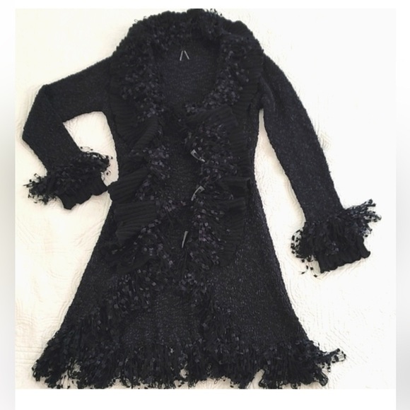 Anthropology Lapis Black Waterfall Ruffle Collar Long Knit Cardigan/Sweater NWOT