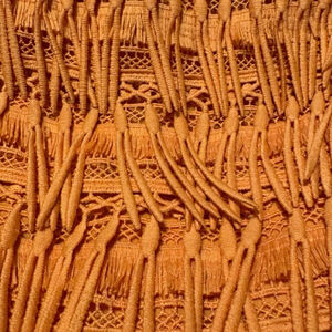 This is a pre-owned Let Me Be by Anthropology strapless mini dress in a Coral hue, size XXS. The dress features a textured design with horizontal rows of fringe-like embellishments over a lace-patterned base. It has a fitted bodice and a flared skirt, with a visible zipper closure at the back. The garment is in great condition with no signs of wear or damage. The care tag indicates "Hand Wash Cold" and "Made in India."