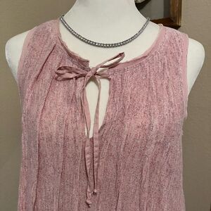 This is a beautiful sleeveless top in soft blush pink. It has distressed/unfinished touches on the neckline and sleeves for style. This top is new without tags.
