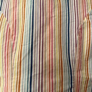 Vibrant striped button-up shirt with short sleeves. Features a mix of pink, blue, yellow, and white stripes.