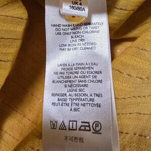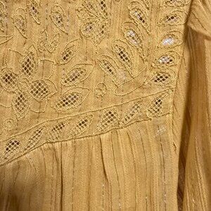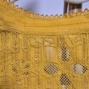 Anthropology Pilcro Mustard Yellow Blouse with Gold Thread Detail Size 4. This boho style house has a yoke that has a cut-out embroidered type detail with lace type detail on the cuff and collar. This is a really pretty deep mustard yellow/gold color and has gold threads that run through the fabric to give just a little shimmer. The tail of the blouse is a little longer than the front. This shirt runs a little big.