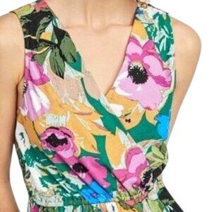 Anthropology Plenty by Ellen Tracy XS Colorful Floral V-Neck Wrap-Look Dress. Elastic stretch cinched waist. Light ruffle light graduated slit hem.